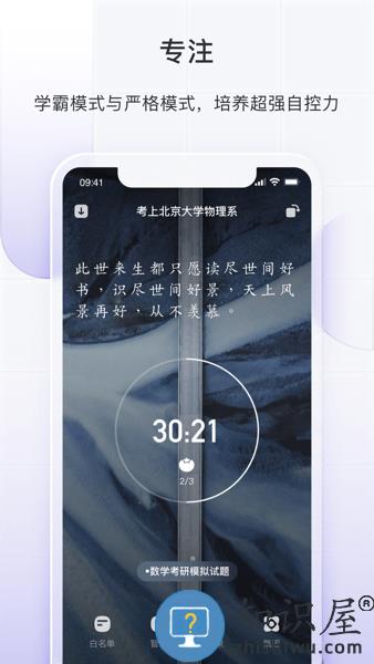 8.放下手机,高效专注--正计时、倒计时、番茄钟随心设置,时长可选,给你很大的自由度。多种专注背景、白噪音,自定义专注氛围。同时满足学霸模式、严格模式、暂停时间的自主设置以及鼓励语个性定制,带给你良好的专注体验。