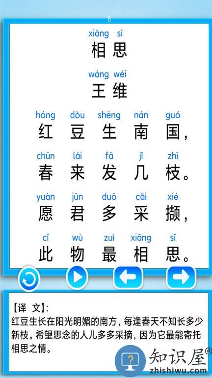 诗词译文,适合中小学生学习的古诗词还会给出大致的释义,并且文字上头都是标注拼音的。