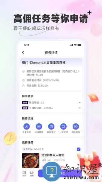 专注于本地生活达人分享、探店种草以及赚取佣金的APP平台。在这里,千万达人们都可以分享自己的生活经验和心得,通过分享获取佣金,实现自己的创造价值和经济收益。该应用平台包含了吃喝玩乐等高佣任务,让用户可以轻松申请任务并获取高额佣金。
