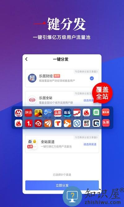 一键分发,完成稿件编辑之后,可以选择多个渠道进行推广,包括有头条乐居