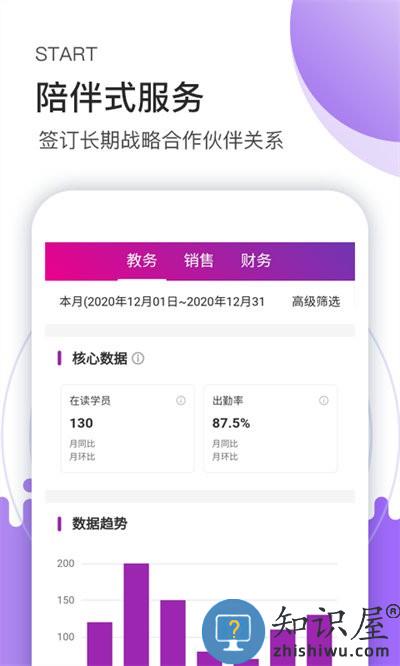 一站式多校区数据化管理系统:线上线下信息化、一站式数据全打通,运用大数据挖掘算法,降低运营成本。强大的统计分析能力,记录2265用户在学习过程中的行为数据,多维度、多指标的交叉分析,让管理者更好掌握运营数据。核心数据深度剖析,为机构决策者提供数据支持