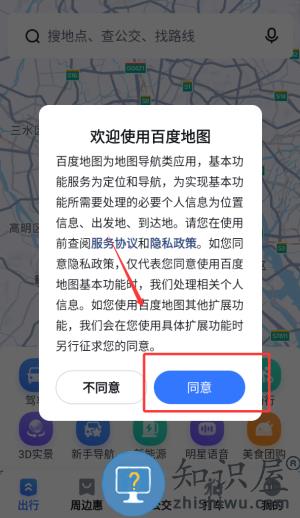 1、阅读并确认服务协议,点击进入公交出行功能主操作界面,开启实时交通信息服务与导航功能。