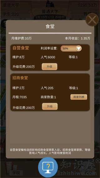 3、食堂 毕竟我当年上学的食堂,贵的要死,所以,我很贴心的,给我的食堂设置的20%利润,本来打算0%,但我也要恰饭嘛。然鹅,第一个档就这么倒闭了。 食堂在有条件的情况下,等级拉满,看上去维护费很高,但是,自营食堂利润100%的情况下,自营食堂收入大约是维护费的2倍。(我的自营维护费40w,收入89w) 招商食堂也是前期的大头,但是有收入上限,满级维护费10w。商家数量上限50个,经过不停的刷租金,我现在月租是90w,基本上再刷不上去。 但是,月租是寒暑假很重要的收入来源,毕竟寒暑假,商业街不开门。
