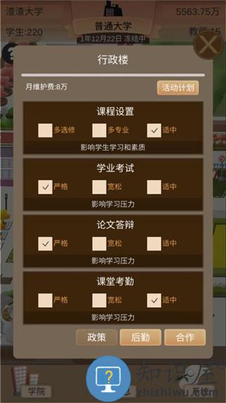 4、学院 学院的支出有三部分 1)设施维护费,目前测试出来,设施对就业率和升学率的影响是最大的,但是维护费高昂,只有在升级学院以及就业率上不去的时候,再拉。另外,似乎设施数量也影响学生的成绩,这个不确定,第一个档我设施是拉满的,第二个档我只放了三个,等有钱了,我再测试。 2)教师工资 能省就省,我之前看别的帖子,拉了一堆助教,现在学院一堆教师,可以招收2540个学生,工资120w,但因为我高学费,只能招收1600个学生(这还是之前有十年招不满),所以完全就是浪费。目前没发现教师等级对学生的影响。 3)专利 专利这个,慢慢拉,毕竟后续有专利要求,然后开发一个专利,耗时还挺长的。 5、后勤 后勤只有校友会可以拉,毕竟搞一次校庆,收入还是可观的。但是等级似乎没必要太高。至于什么安保、消防,1级就行,出现事件,只要花钱,就没有负评价,甚至有正评价。 6、图书馆 目前没看出来图书馆对学业的影响有多大,反正我的是拉满着,毕竟图书馆的维护费也不是很大。把自动购书选上即可。 7、体育馆 体育馆跟图书馆一样,似乎影响不大,所以按照任务做就可以。据说对社团也有影响,不确定。 8、社团中心 社团中心看心情吧,学生会等级似乎影响社团数量,之前好几年没开学生会,一个社团都没有。现在一堆社团,维护费成了最高的108w,社团影响学生素质,影响就业率,影响程度没测试,不是很确定。 9、活动支出 开学时候你可以选择各种活动,什么迎新啊,毕业啊之类的,都会触发事件,建议全开。 活动支出的标准是根据学校等级来的,这也就是为何前面我说要卡学校等级的原因。 比如我现在市重点,7个活动每年就要420w的支出。在财政紧张的情况下,还是很恐怖的,所以,学校等级能卡就卡,不然等级太高,支出又高,又因为难以达标造成奖励较低,得不偿失。 10、赛事支出 赛事是跟社团对应的,每个赛事都是6w块钱,不差钱可以考虑,赛事是发展社团的重要方式。每次参加赛事都可以提高社团的人气,进而提高等级。因为还在前期,没获过奖,不知道奖金可观不可观。