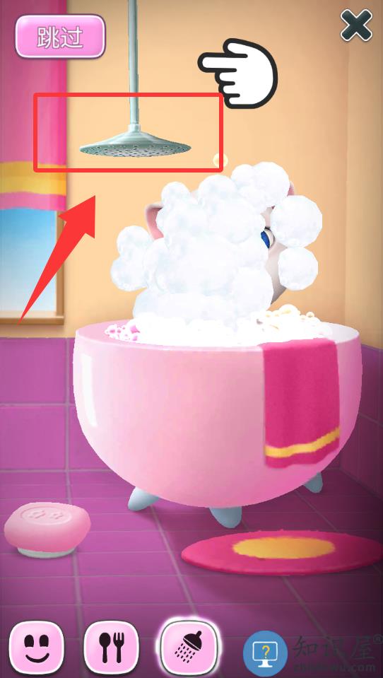 3、点击红色框框里的花洒给猫咪冲身上的泡沫。