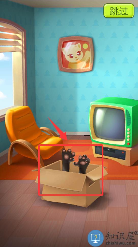 2、点击红色框框里的纸皮箱里的小猫咪。