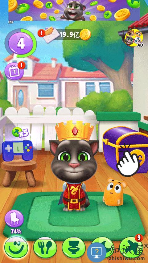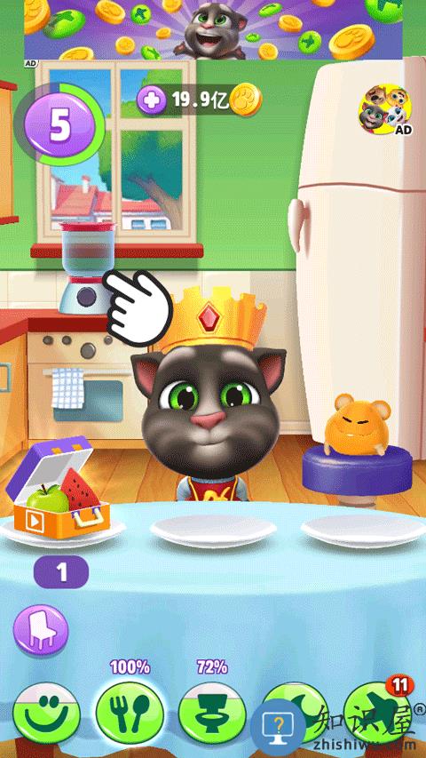 2、进入游戏,即可看到金币为20亿,代表破解成功,下方的四个按钮对应汤姆猫公寓的四个场景,其中会显示汤姆猫的开心程度、饥饿程度、疲劳程度等。