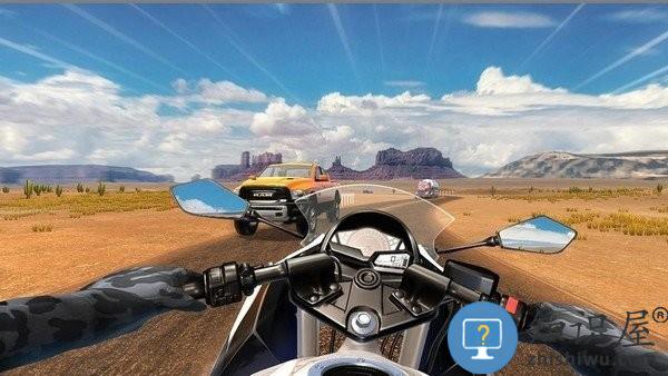 1、通过摇动手机或使用虚拟按键来控制摩托车方向加速和刹车注意躲避公路上的其他车辆。