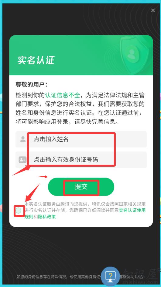 2、输入真实姓名和身份证号码然后打√并提交。