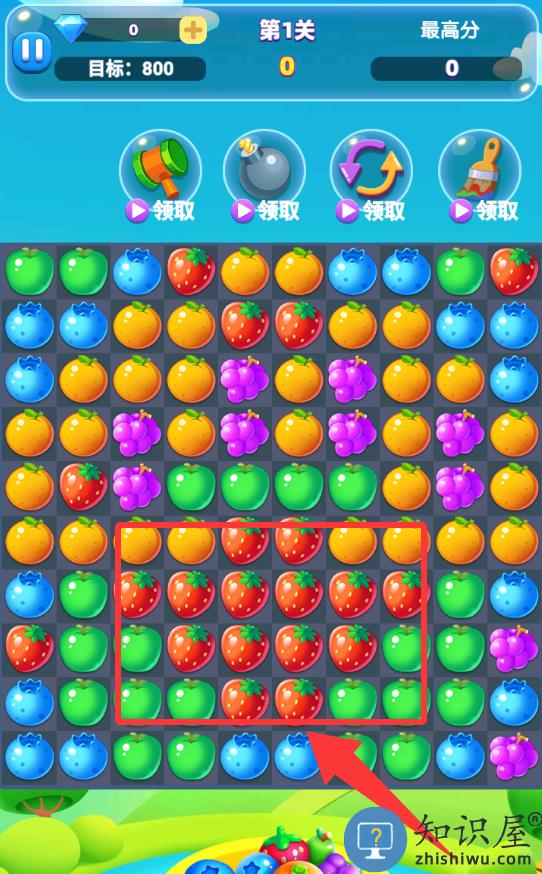 2、进入游戏界面点击红色框框咯的水果消消消并进入。