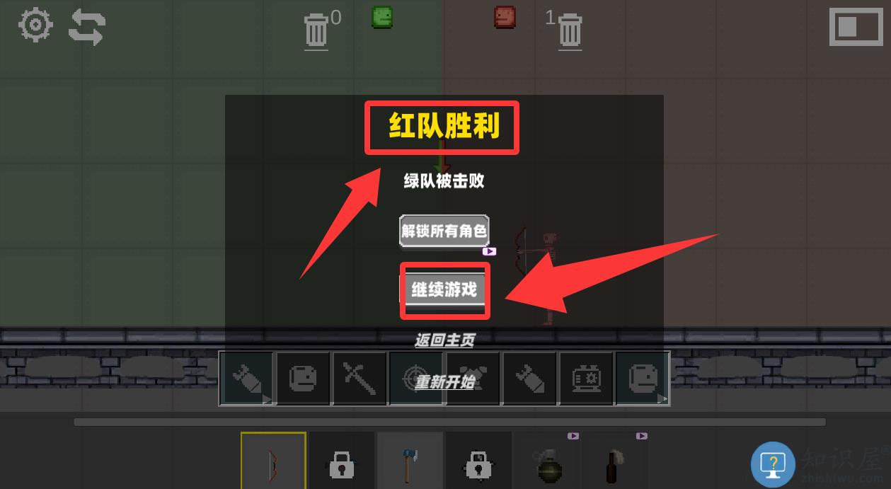 2、恭喜你红队胜利了,点击红色框框里继续游戏。