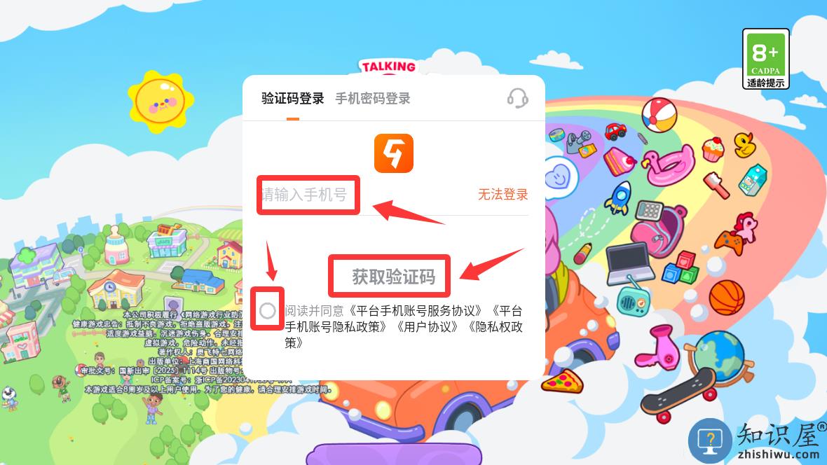 2、输入手机号码获取验证码然后打√填写验证码登录。