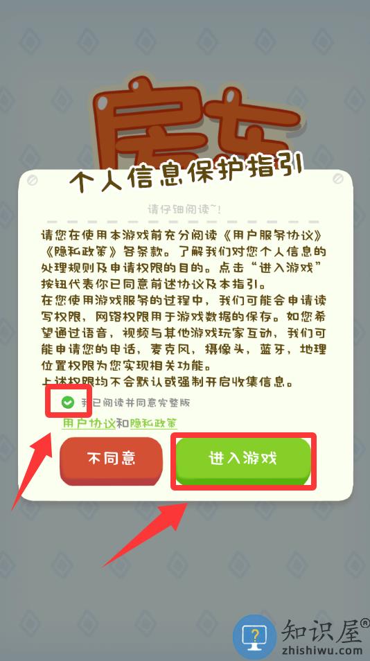 1、点击个人信息保护指引里的打√然后进入游戏。