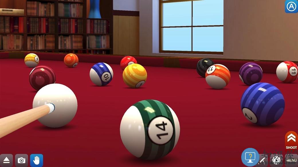 开启后通过滑动手指可以拉动镜头来观察游戏界面;第二个太阳按钮是调整周围的光线强度的;第三个眼球按钮是调整你的视角的;进入游戏后,在游戏界面下方是一排的击球设置选项,最左边的是放大缩小按钮,右边第一个是调整球杆与桌面的夹角的;第二个按钮是球杆击球的位置;第三个是击球按钮,你将所有的设置都调整好了以后,就可以点击“Shoot”.当没有点选下面的那一行中的任意一个按钮的时候,滑动屏幕可以调整球杆的方向.游戏玩法的多样性,包括美国8球、英国8球、9球等多达10多种玩法。
