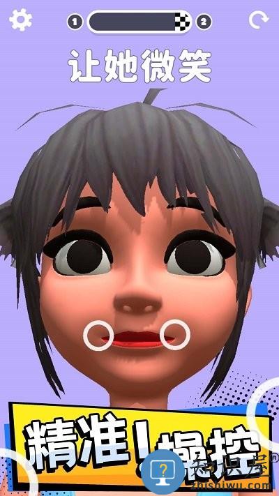 3、进入游戏这关任务是帮她微笑,点击她的嘴两边撑开就可以通关了。