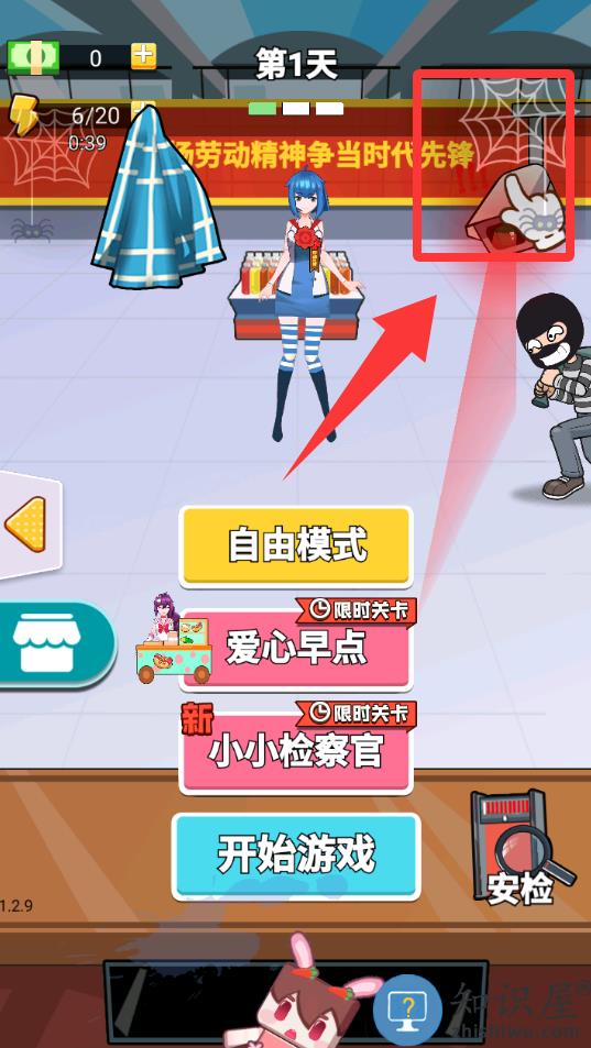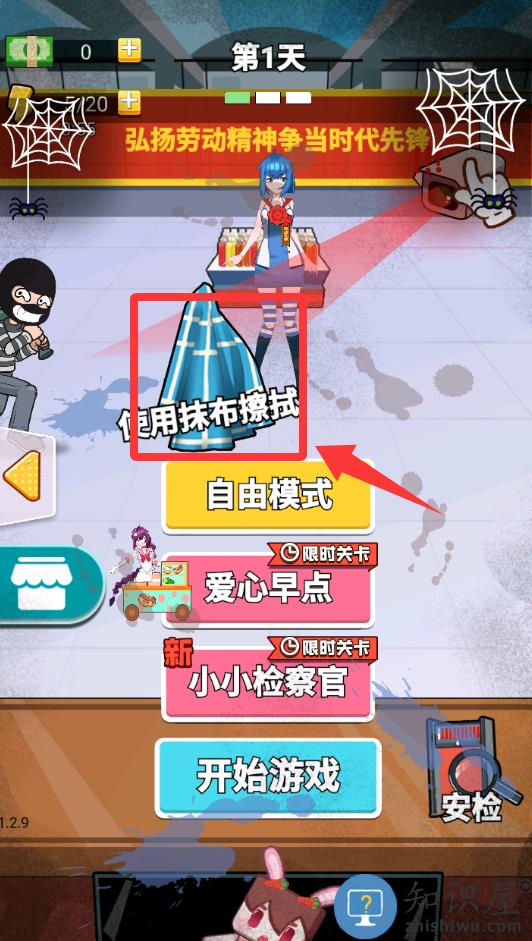 1、进入游戏界面点击红色框框里的抹布擦地上的水迹。