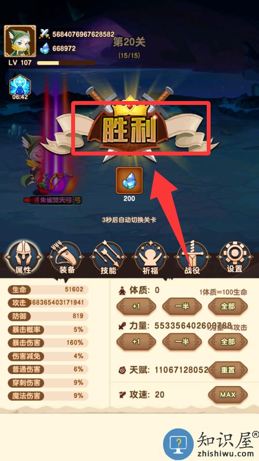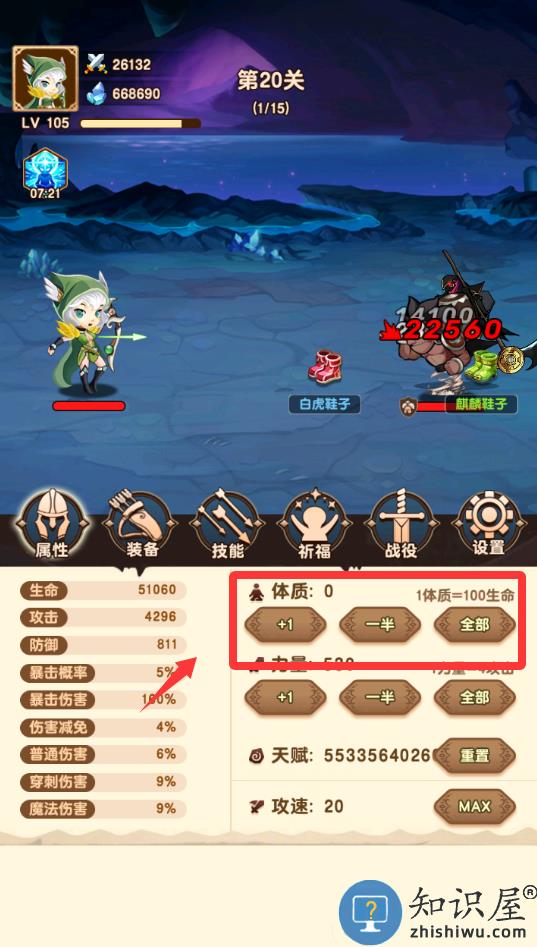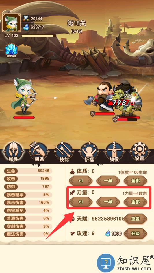 1、进入游戏点击红色框框里的属性升级增加攻击力。