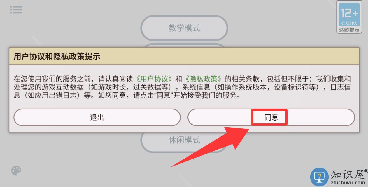 1、点击用户协议和隐私政策提示里的同意并进入。