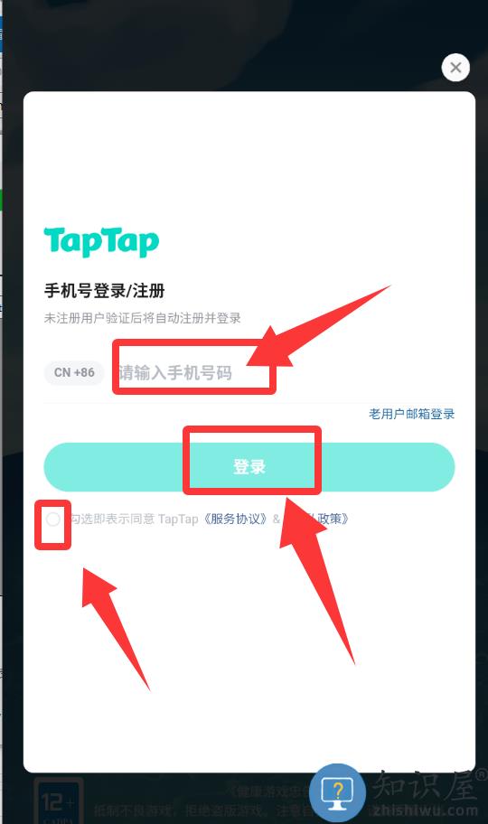 3、先在红色框框里打√并输入手机号码获取验证码然后登录。