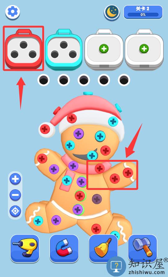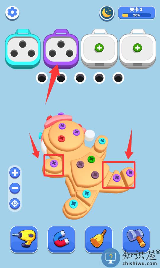 1、进入游戏把对应颜色的螺丝拧下来3个就会消除。
