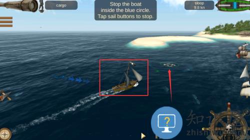 2、点击船帆按钮减速,将船停入蓝色圆圈区域。