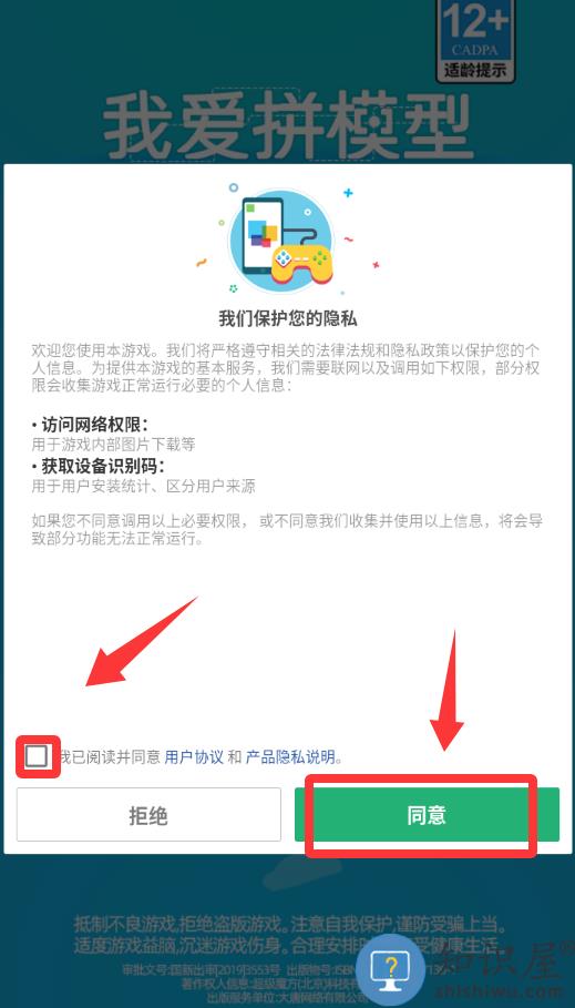 1、进入游戏点击红色框框里打√然后点击同意并进入。