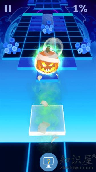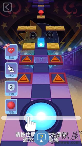 2、期间无需上滑使球跳起,方向最重要,会自动跃过方块,只需操纵落点方位,遇到红色图案的钻石,滚到所在位置吃掉,一路沿着缝隙处穿滑而过即可。