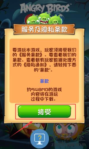1、点击接受按钮,确认服务及隐私条款开始游戏。