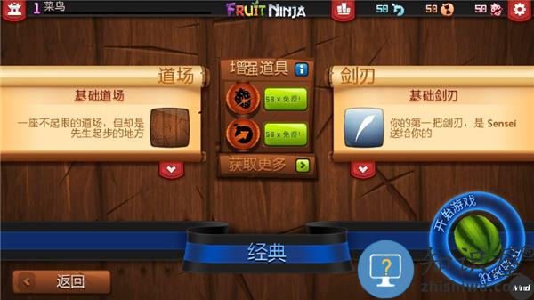 1、点击进入经典模式,在游戏开始之前玩家可以可以选择一下道具来帮助自己能够快的进行通关,还可以选择不同的剑刃开帮助自己获取高分。