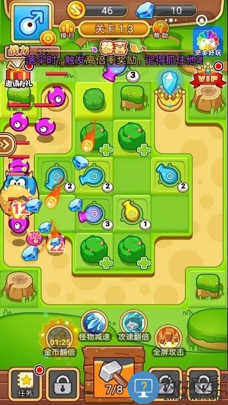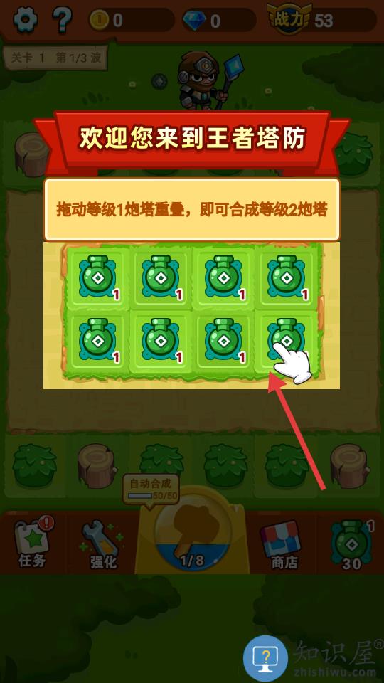 1、通过放置相同炮塔进行合成升级提升威力。