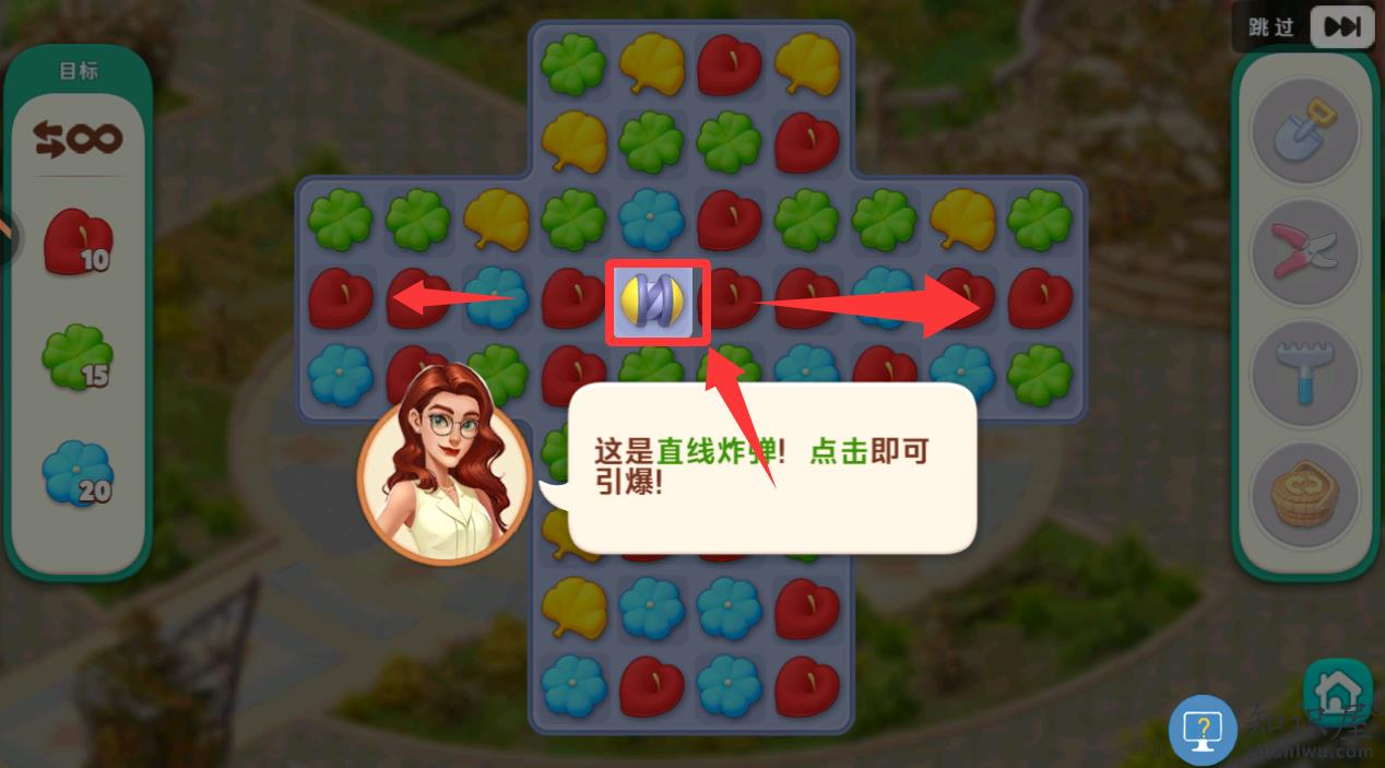 2、进入游戏红色框框那个道具是直线炸弹,点击即可引爆。