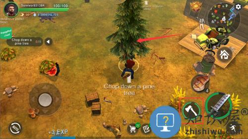 1、装备斧头砍倒松树,收集木材获得经验值。