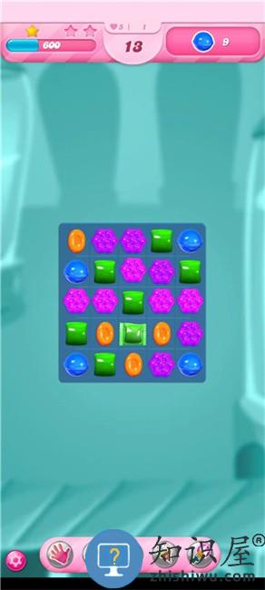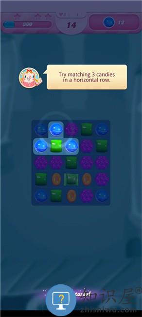 5、继续尝试将相同颜色形状的三颗糖果排成一行;