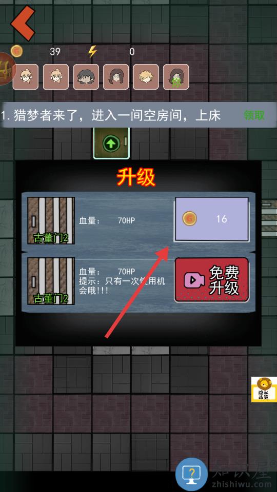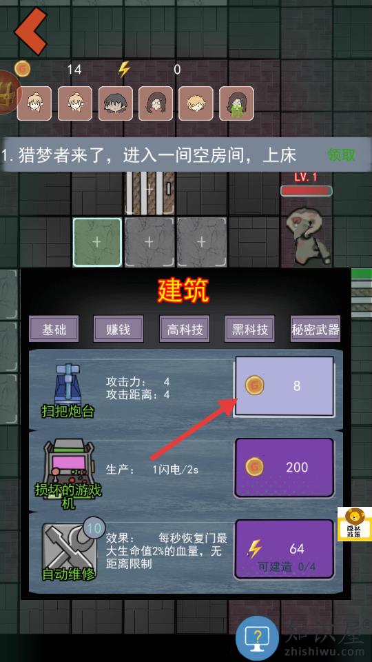 2.在床上躺平就能涨金币,用你的金币购买防守工具和建筑,建立你的设施和防线