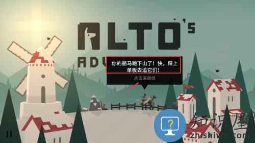 1、点击屏幕中央继续按钮,开始阿尔托的滑雪冒险之旅。