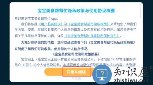 1、阅读隐私政策后,点击底部被红框和箭头标注的橙色同意并继续按钮,确认进入应用。