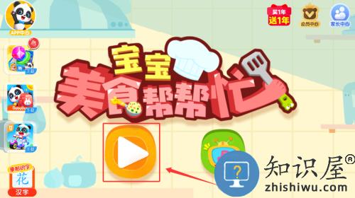 2、在应用主界面,点击中央被红框和箭头指向的橙色三角播放按钮,启动宝宝美食帮帮忙游戏。
