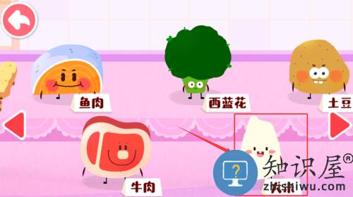3、在食材选择界面,根据红框和箭头提示,点击最右侧的白色大米图标进行选择。
