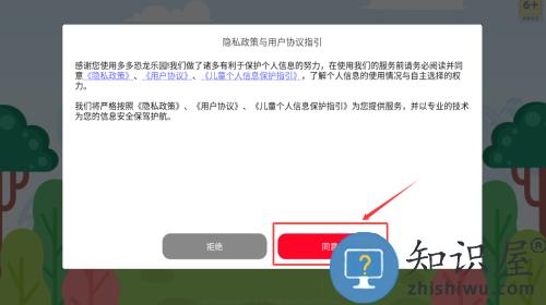 1、阅读隐私政策后,点击被红框和箭头标注的红色同意按钮,确认进入应用。
