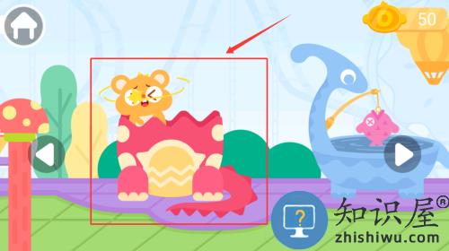3、根据红框和箭头提示,点击骑在红色恐龙上的橙色小熊进行互动。
