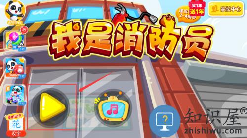 2、在游戏主界面,点击中央被红框和箭头指向的黄色三角播放按钮,开始消防员角色扮演游戏。