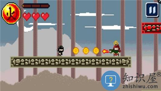 1、操控忍者横版闯关消灭沿途敌人避开陷阱机关。