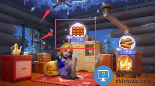 3、火堆做好了现在屋顶要修复,点击红色框框里的修复。