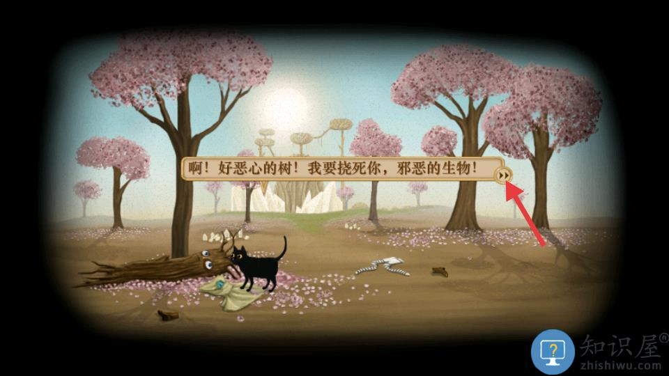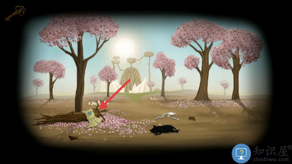 春天,来到雕像那里,推开地上的木头堆出现一个小洞,猫咪进去