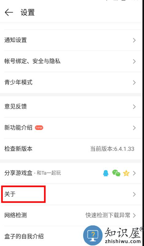 2、进入设置界面,选择“关于”,即可查询盒子客服联系方式。