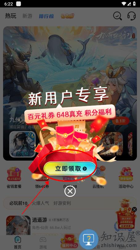 首次打开app,如果您是新用户,可以领取超值大礼包,点击立即领取;