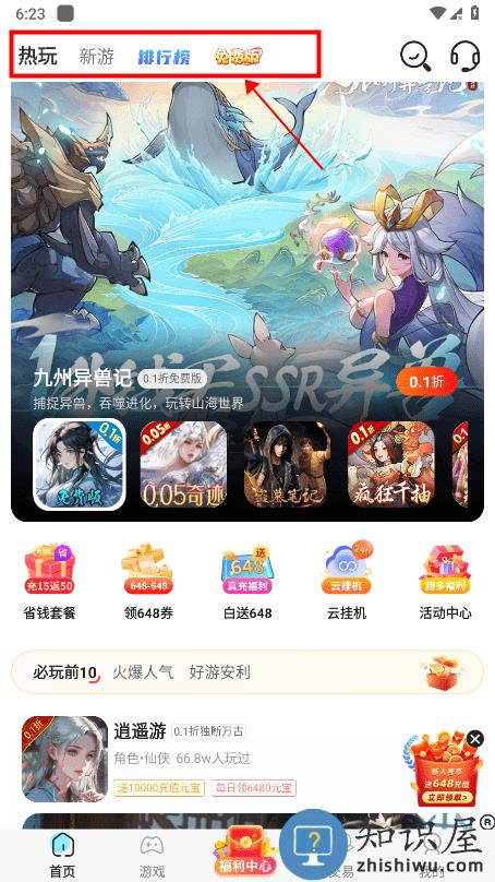 进入app首页,可以看到热玩、新游、排行榜、免费版四大板块;