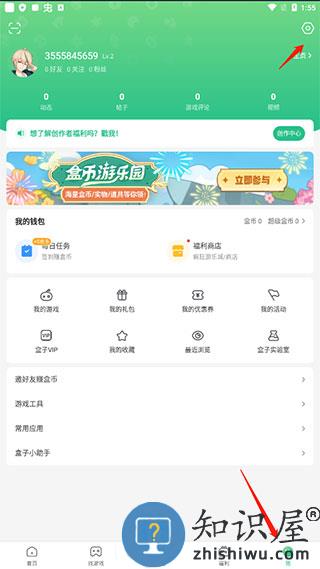 手机打开“4399游戏盒”后,在“我”界面中, 点击右上角的设置按钮(六角螺丝图标),如图所示。