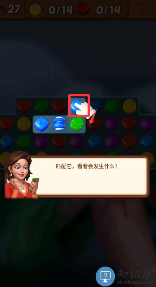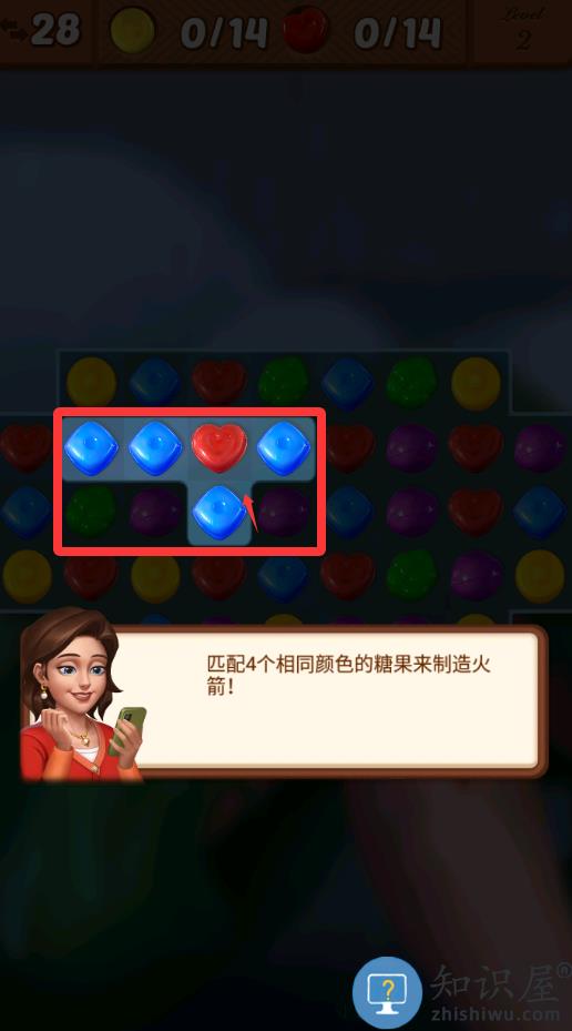 1、把蓝色的方块移动上去进行4消会得到道具。