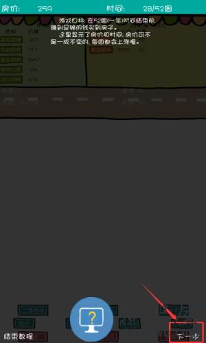 3、在游戏界面点击红框标注的下一步按钮,继续房产经营教程。